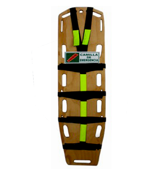CARACTERISTICAS Camilla rígida con inmovilizadores en velcro utilizada para casos de emergencias en espacios públicos y cerrados con empuñaduras en los bordes para traslado más estable. Medidas: alto 190cm, largo 40cm, ancho 6cm. Color madera natural. Señalización y soporte para pared. (No incluye inmovilizador de cabeza).
