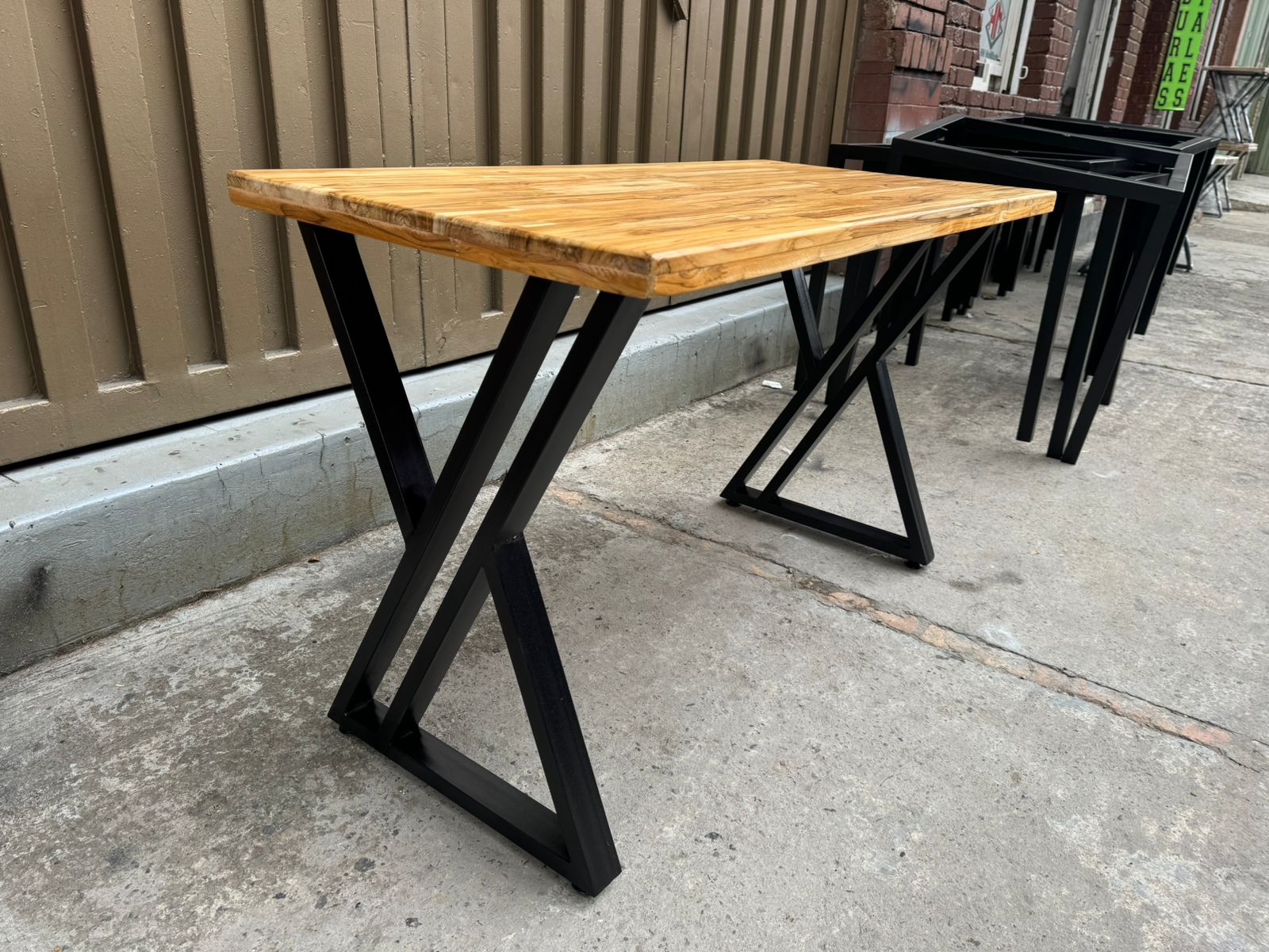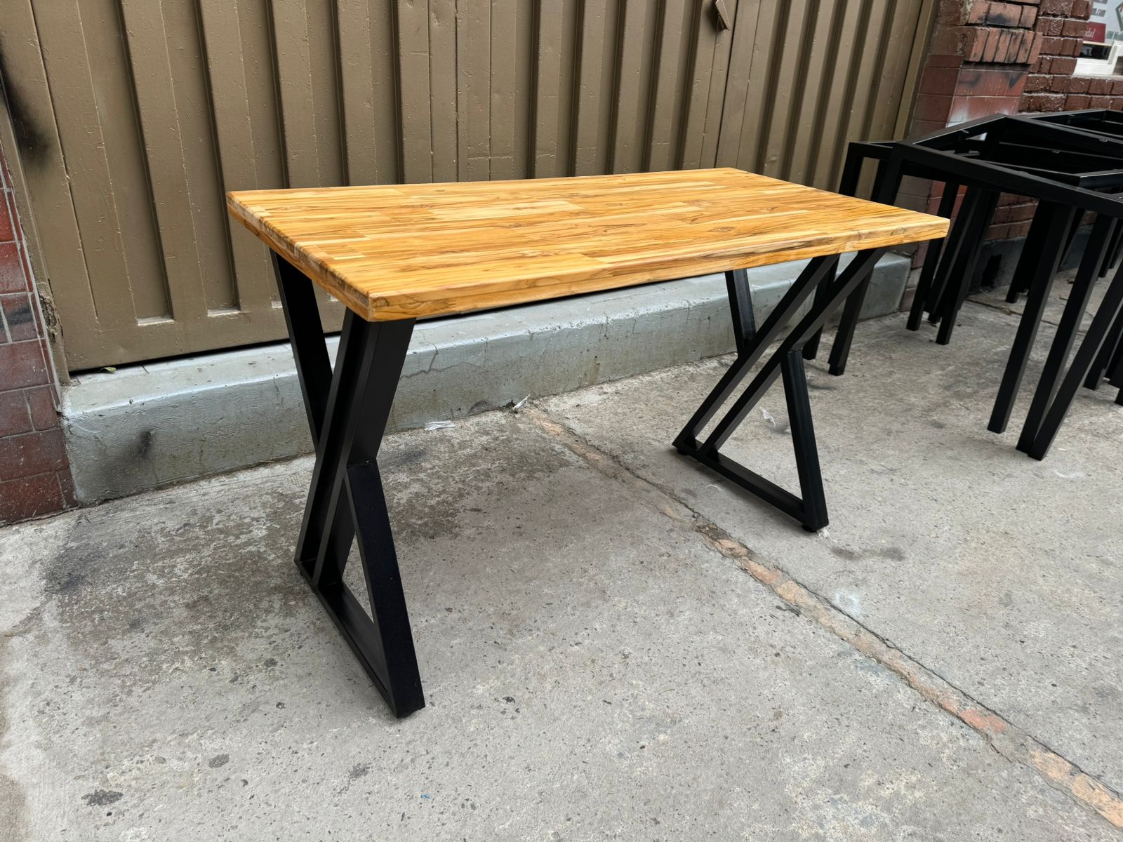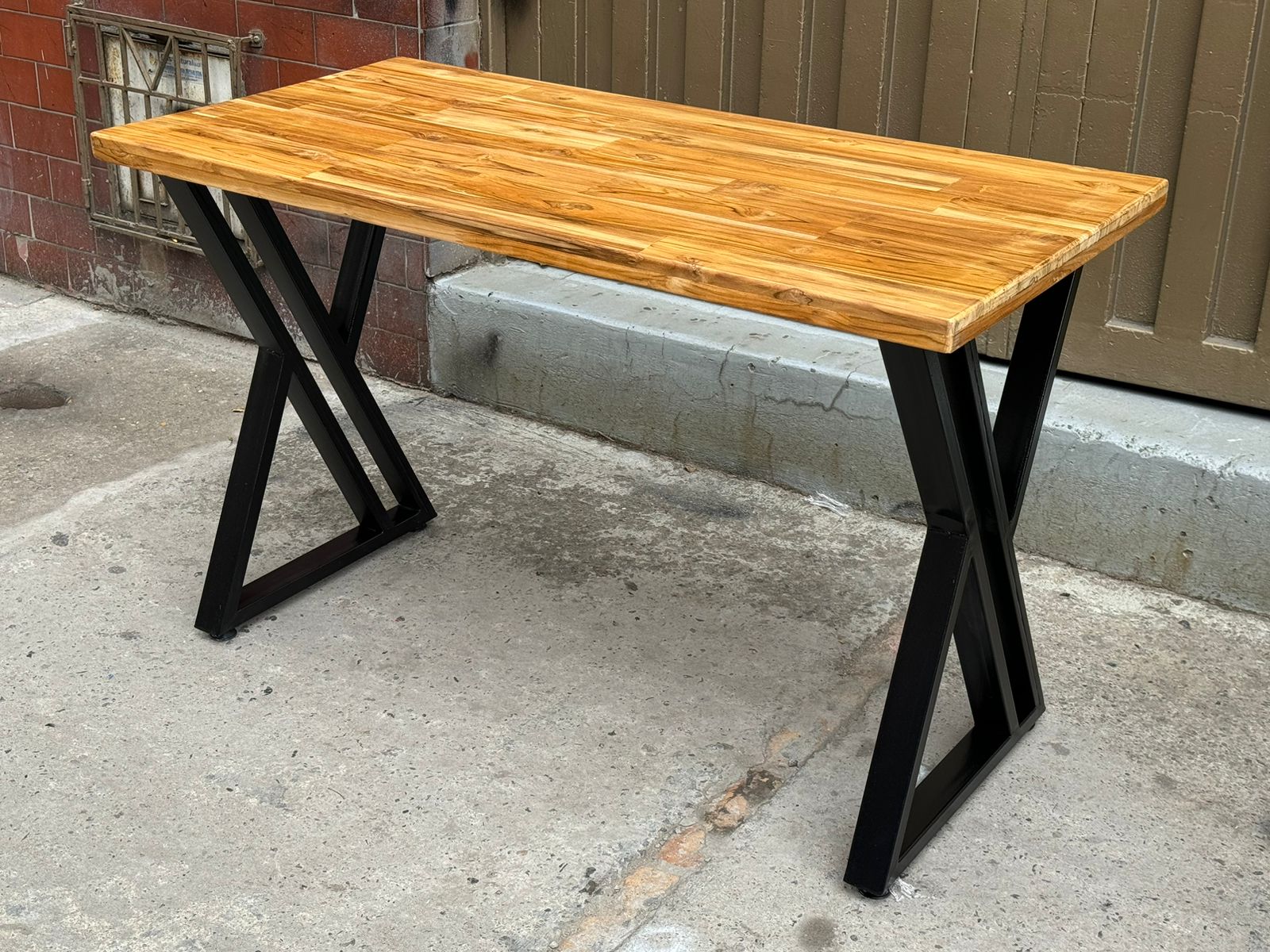 MESA DE 120 CM X 60 CM CON TAPA EN TECKA Y ESTRUCTURA METALICA EN TUBO 2X1… PINTURA ELECTROSTATICA, RECOMENDADA PARA EXTERIORES.